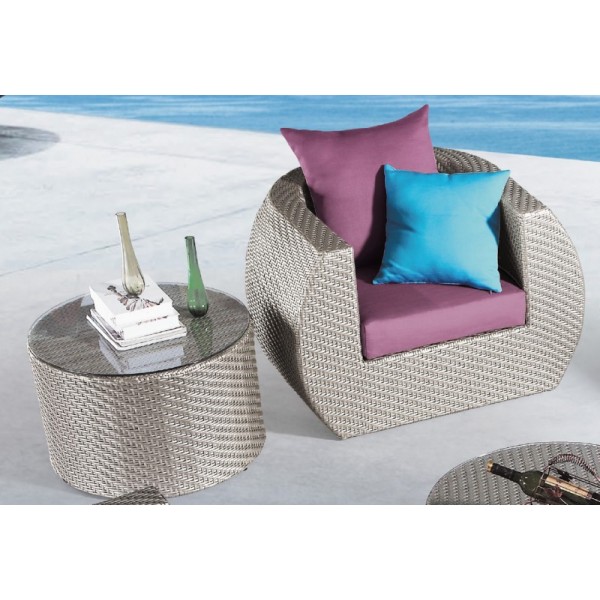 Ce fauteuil de jardin 1 place de la gamme CEYLAN a une forme très particulière et décalée puisque de forme toute arrondie au niveau du dossier pour une touche ultra-tendance. Le revêtement est en résine tressée de coloris gris avec des reflets argentés pour le plus bel effet design. Prélassez-vous confortablement et sirotez un petit verre au soleil sur ce fauteuil de jardin et ses coussins décoratifs pour le dossier de coloris bleu ou mauve (au choix) qui sont inclus. Ce modèle existe en fauteuil 1 place mais aussi en canapé de jardin en résine tressée 2 ou 3 places  Essayez-le et rendez-vous compte de vous même, ce fauteuil de jardin est une perle rare !